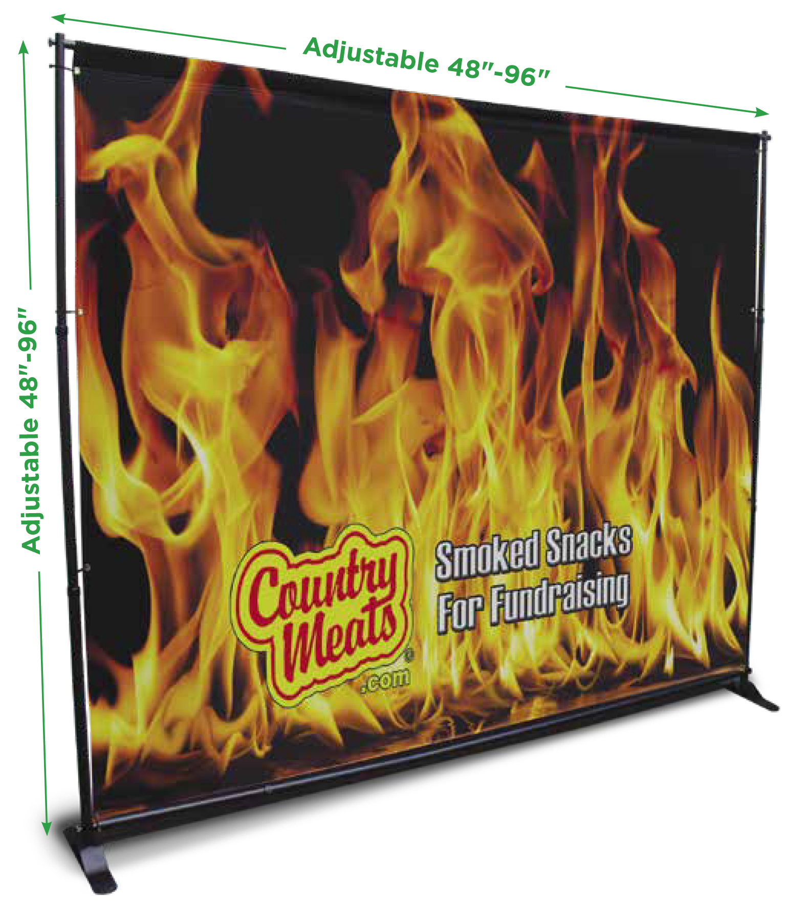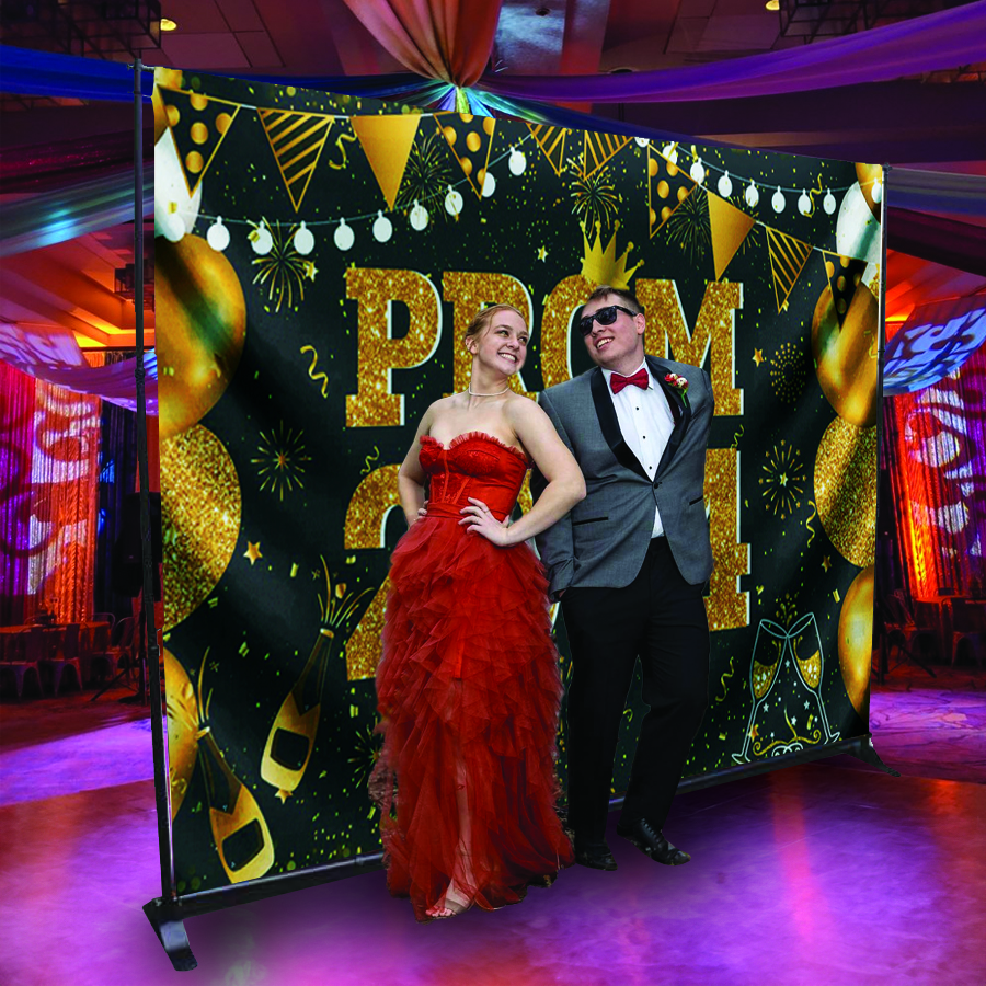 The Step & Repeat Backdrop is a straightforward, simple design that works perfectly. This backdrop is freestanding with telescoping poles that adjust to fit various sized banners. The adjustable aluminum frame can be set sized between 48” to 96” in height and 48” to 120” in width. The cloth backdrop banner is constructed with a pole pocket at the top where the horizontal crossbar passes through, supporting the custom cloth backdrop. To keep your backdrop banner taut, there are two grommets installed on the lower corners of the fabric, allowing customers to use bungees to create downward pressure on the banner. This backdrop displays your graphics beautifully at various sizes.